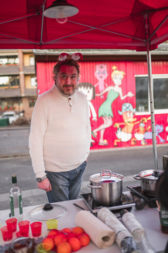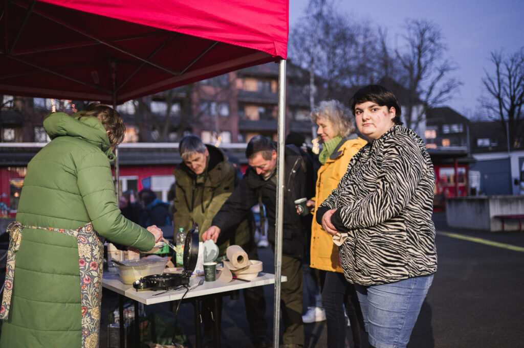 Susanne Dickel versorgt die Gäste mit leckerem Punsch- bzw. Glühwein und auch am Waffelstand von Susanne ist viel los – beide sind von der Initiative platzgrün!. Stefan ist etwas ungeduldig und will wissen, ob schon eine fertige Waffel da ist, wird aber ganz kurz vertröstet.