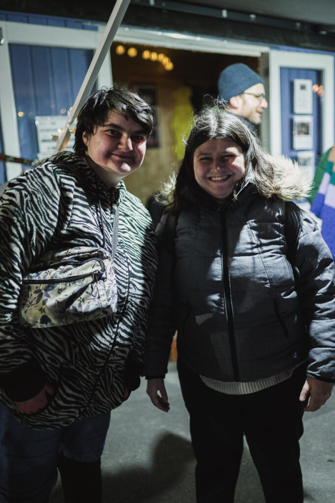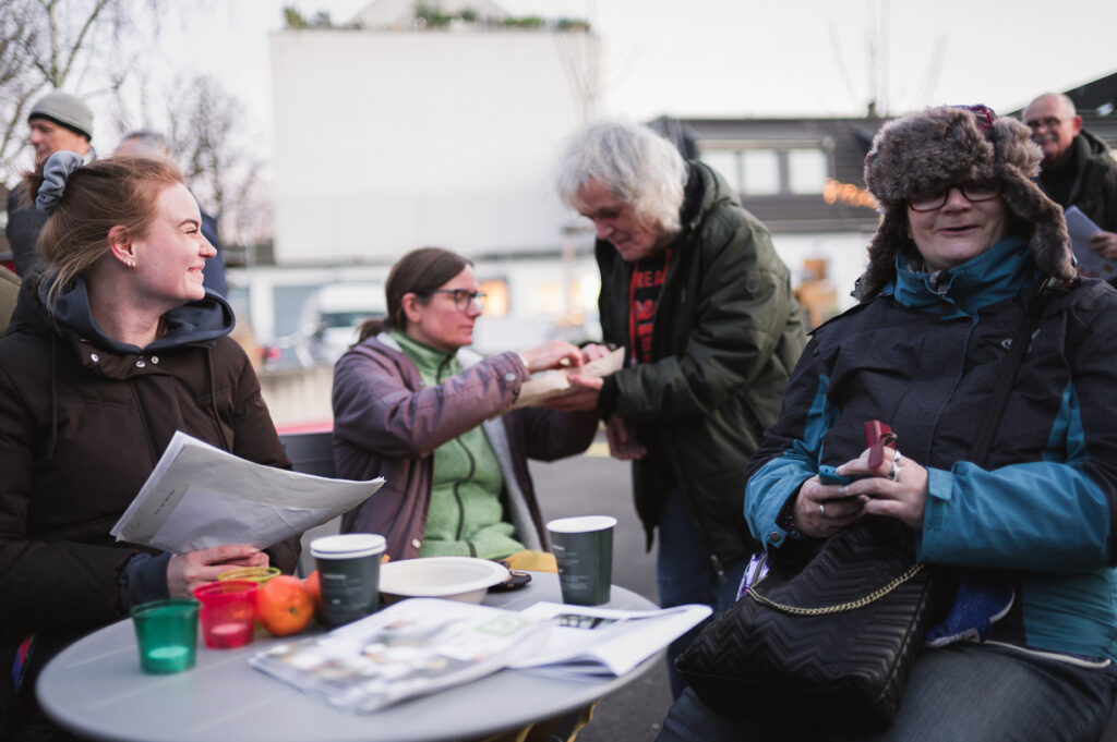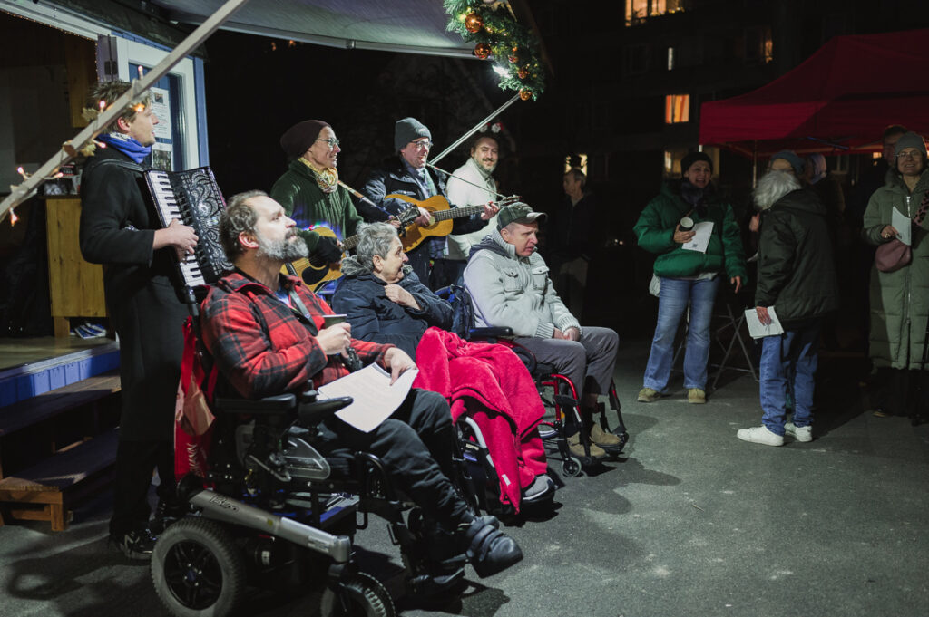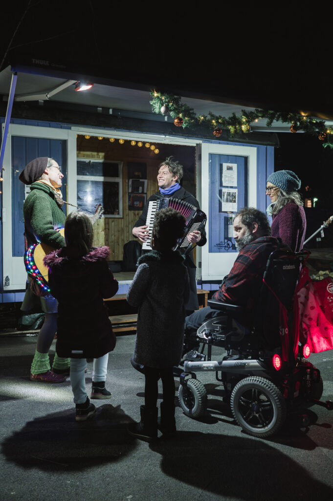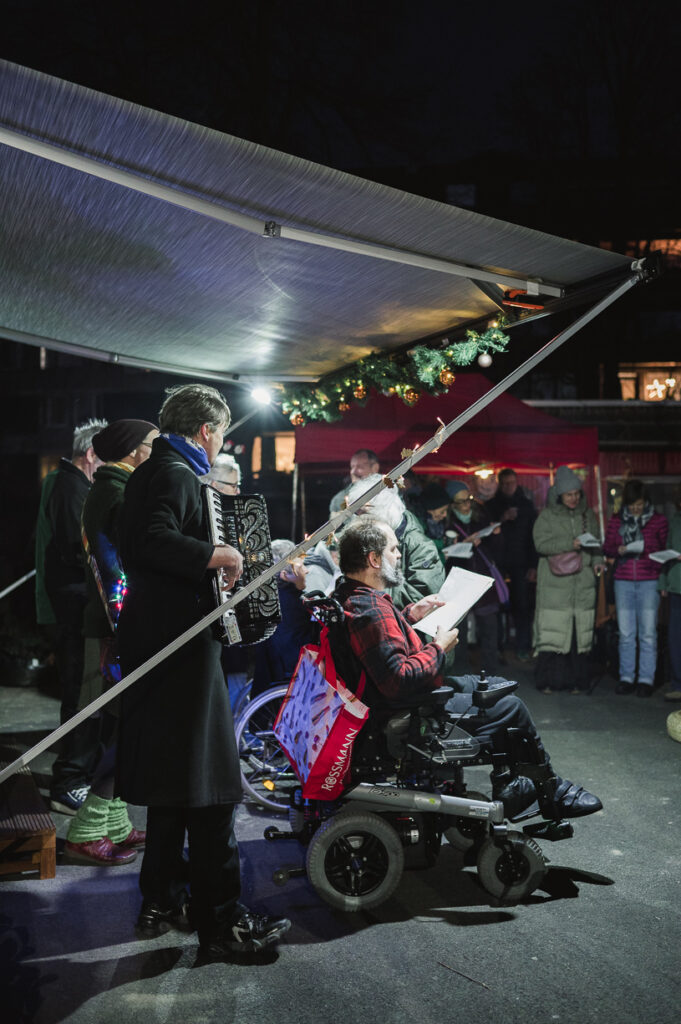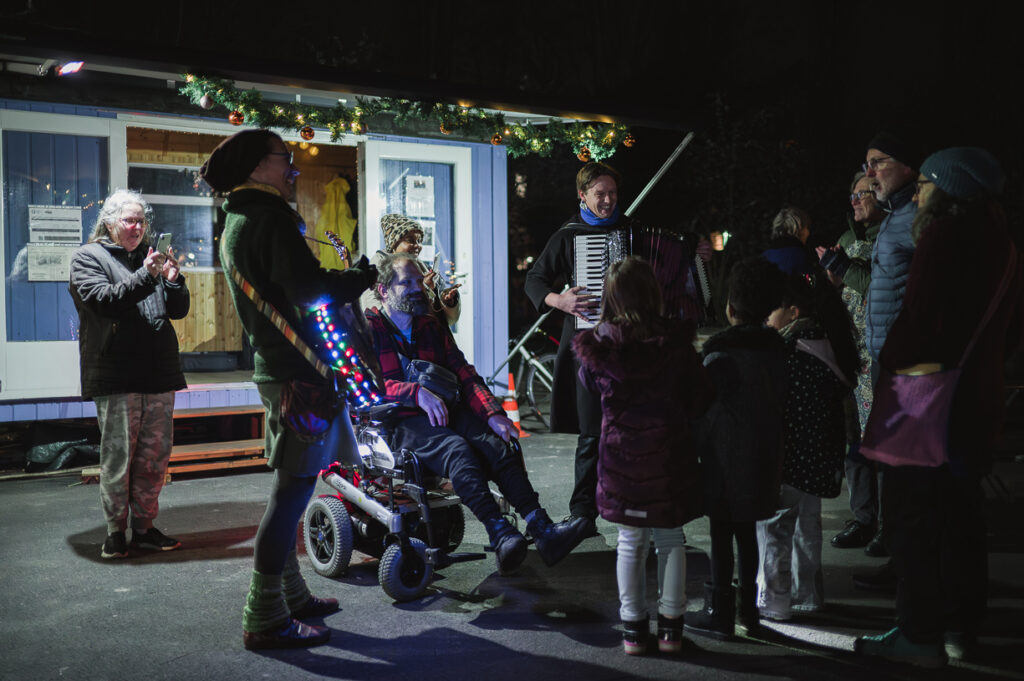 Der Bauwagen bietet eine schöne Kulisse für den IGL-Chor, der mit Liedern wie „Let it snow“, „Santa Claus is coming to town“ oder „Kling, Glöckchen, klingelingeling“ stimmungsvoll auf Heiligabend einstimmt. Elisabeth und Heiko gehören mit zu den Initiatoren des inklusiven Singkreises und freuen sich sehr über die Unterstützung von Tenor Sandro Hähnel, der an diesem Abend spontan mit dem Akkordeon vorbeigekommen ist, und Chorleiterin Christine Tews an der bunt beleuchteten Gitarre und Flemming an der zweiten Gitarre unterstützt. Der Chor geht auf die Initiative von Klienten:innen der IGL zurück, steht aber allen offen. „Jeder, der mitsingen will, darf sich bei mir melden“, ergänzt Christine Tews.